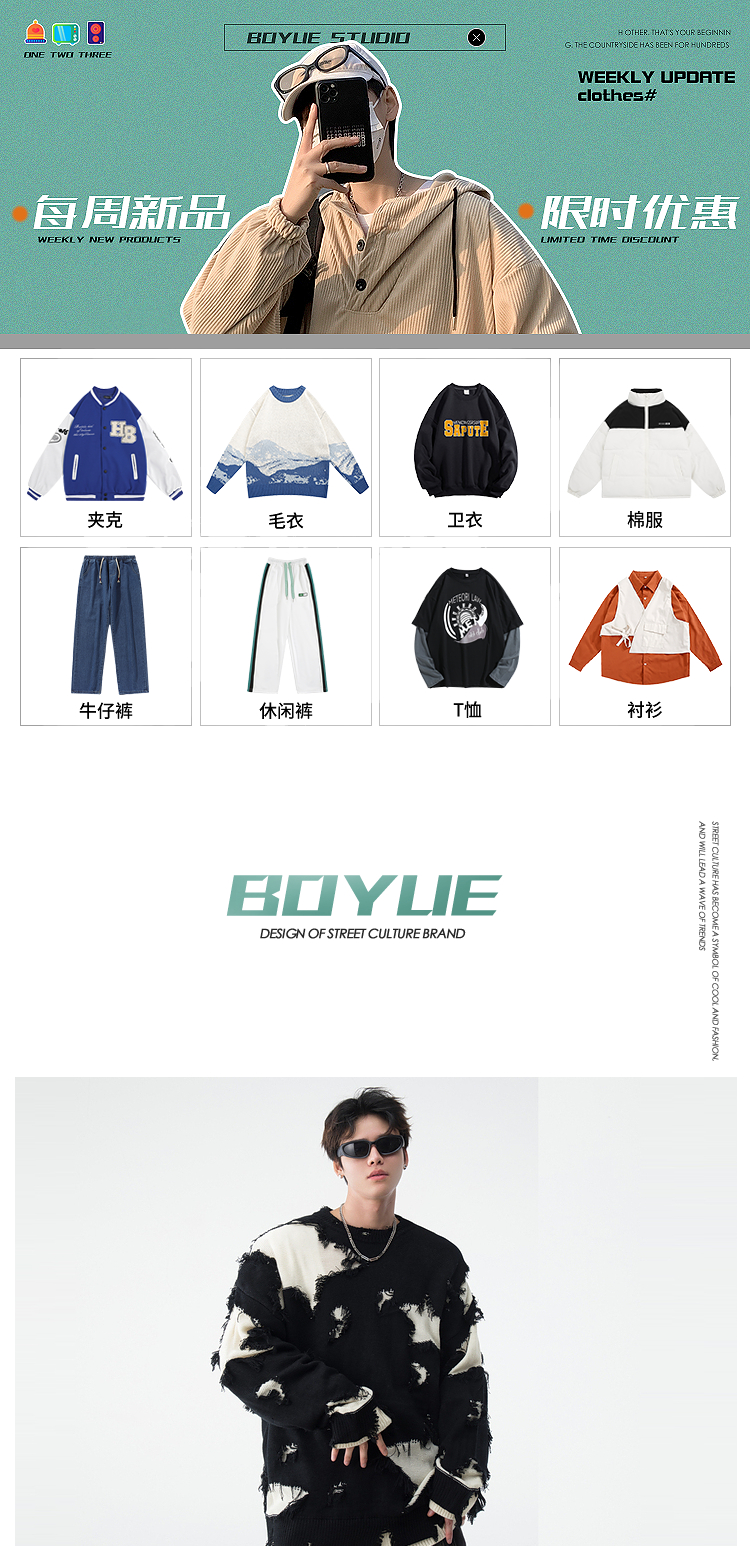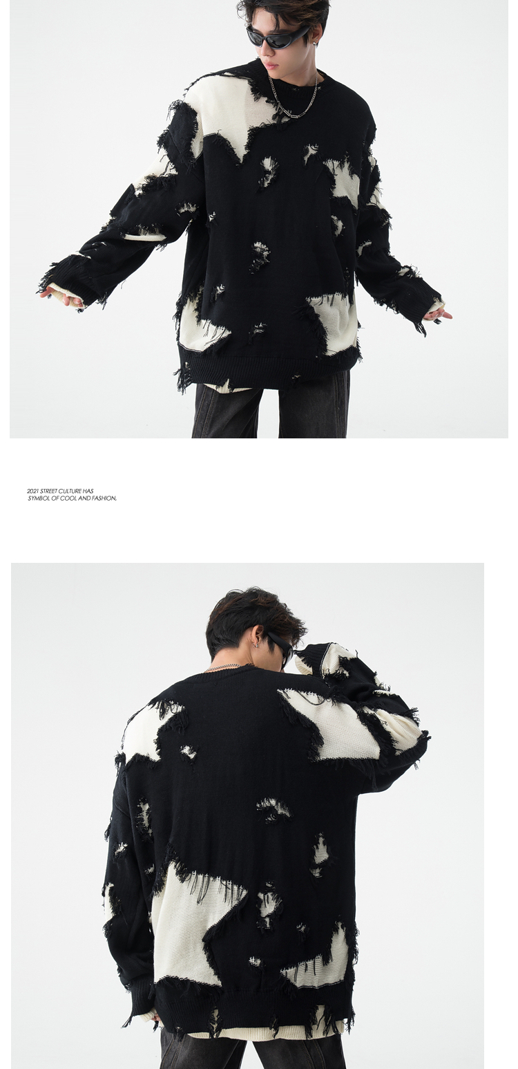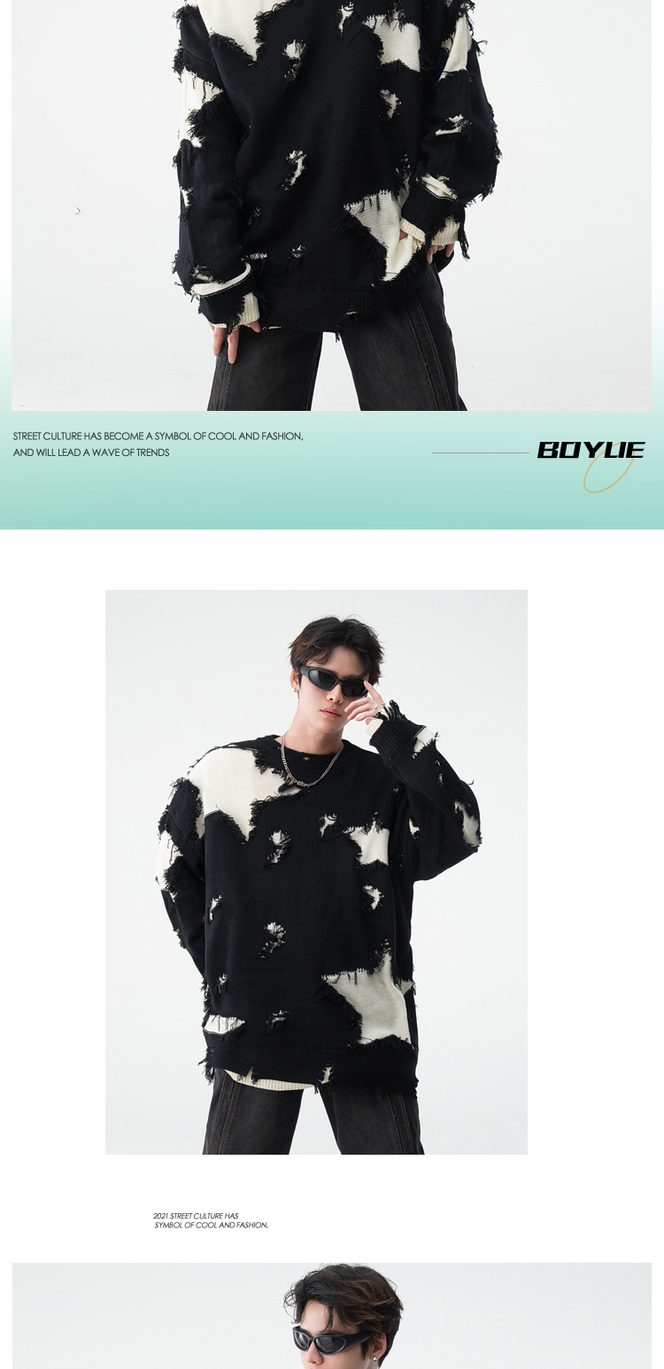 BOYUE帛跃星星破洞毛衣美式小众毛边破烂风男女时尚重工针织衫潮的描述